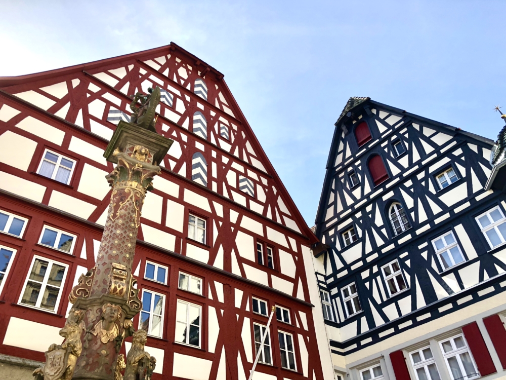 Der „Goldene Hirsch“ liegt nur 50 Meter vom meist fotografierten Flecken in Rothenburg entfernt, dem „Plönlein“, einem winzigen Fachwerkhaus neben dem Kobolzeller Tor. Selbstverständlich musste ich wieder mal, wie immer, vorsichtig die ausgetreten Stufen hinabsteigen und einen Finger in den Springbrunnen tauchen. Keine Ahnung, warum ich das immer mache. Versuchen Sie es einfach, es hat was.