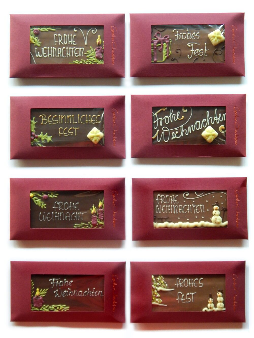 So finden sich weihnachtliche Schokoladentafeln, Lebkuchentrüffel und Spekulatius-Sterne ebenso im Sortiment wie Schneemann-Pralinen oder Weihnachtsglocken mit Nougat-Zimt Füllung. 30 verschiedene weihnachtliche Sorten dürften für Genießer Grund genug sein, in der Goethe Chocolaterie im Rahmen des Weihnachtsmarkt-Besuches vorbeizuschauen.