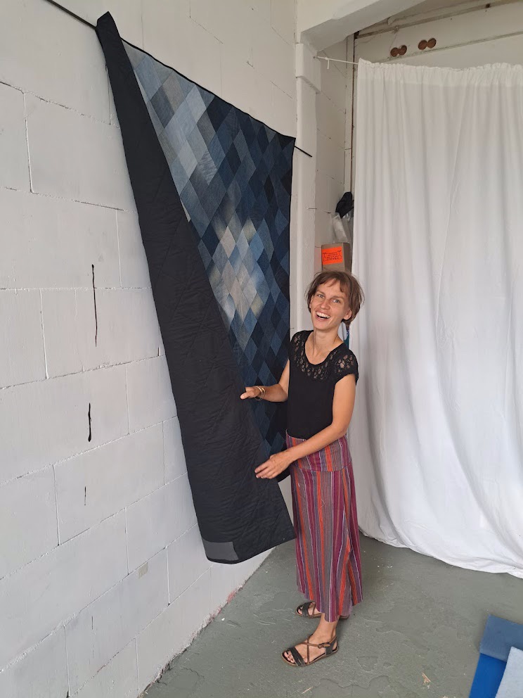 Für einen besonderen Quilt aus Jeansstoffen genügte ein Rundruf im persönlichen Umfeld und so fanden ausrangierte Jeanshosen erst den Weg ins Atelier und dann – neu zusammengesetzt – auf ein Patchwork-Unikat. Diese Nachhaltigkeit ist der Designerin sehr wichtig – ohne sie geht nichts.