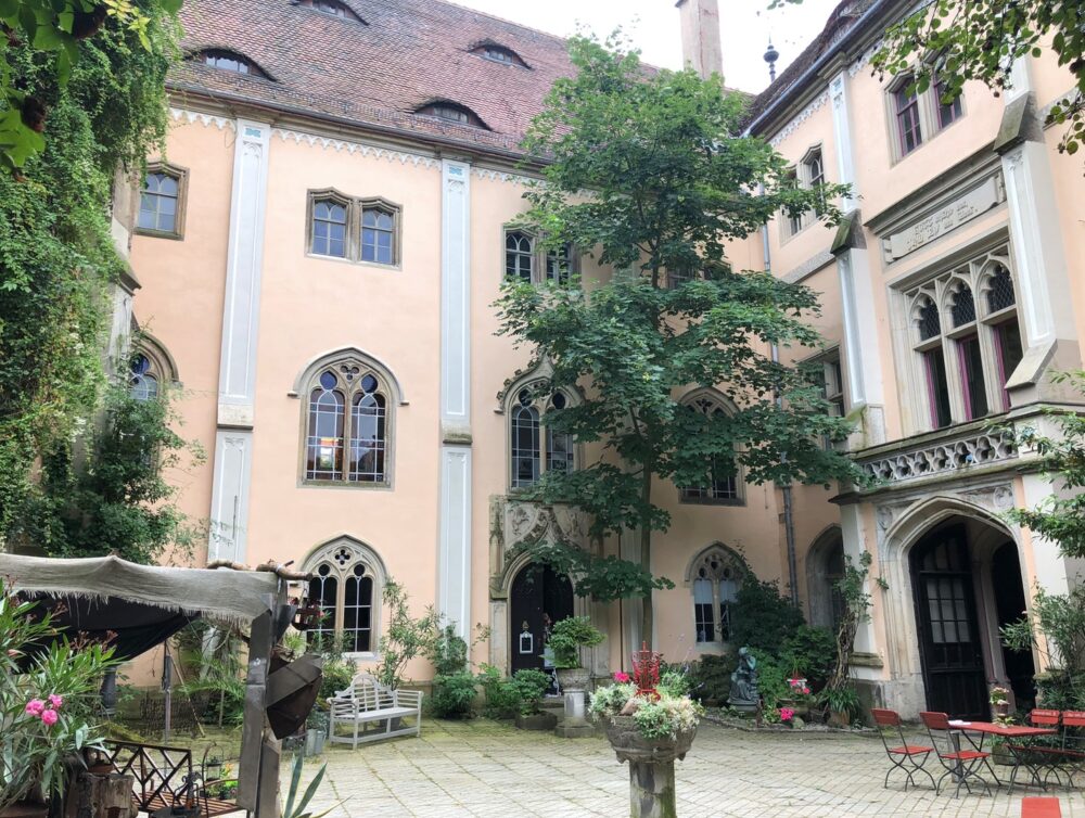 Die Tour endet mit dem Schloss Püchau (im Bild der romantische Schlosshof), einem barocken Schloss, das von einem malerischen Park umgeben ist.