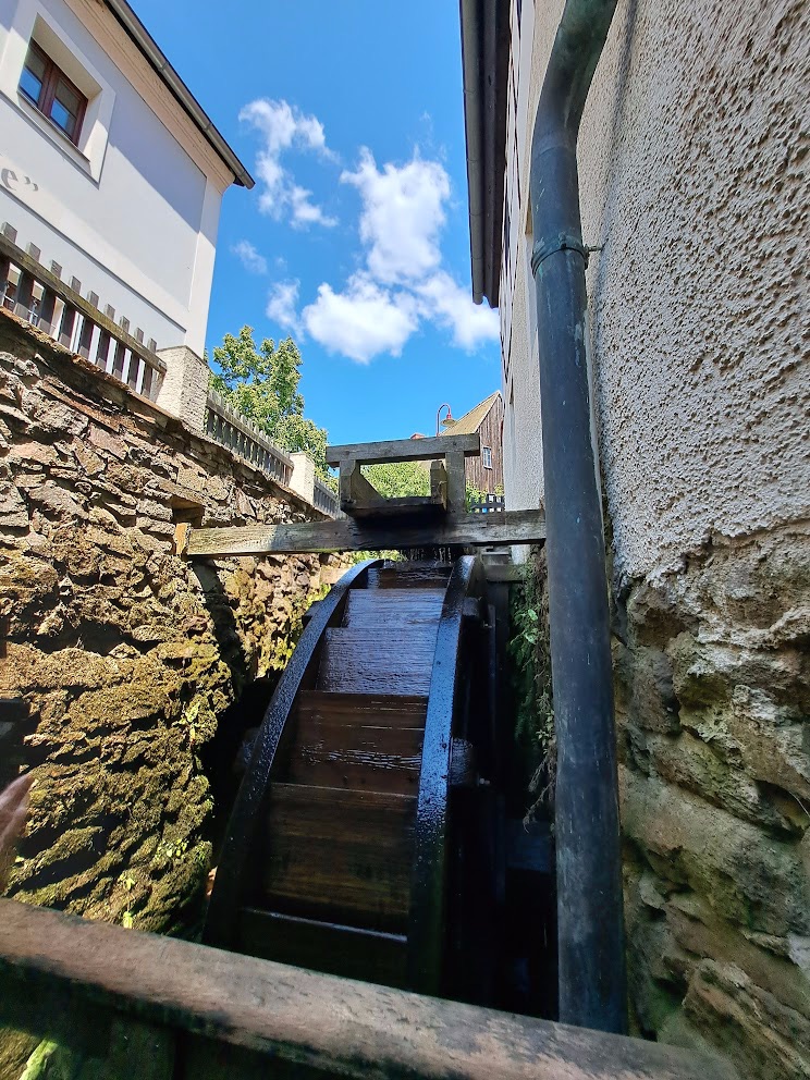 Nach einiger Zeit erreichen Sie die Wassermühle Höfgen, eine historische Mühle, die heute noch in Betrieb ist und im Erlebnisdorf Höfgen liegt, das für sich genommen schon einen Besuch wert ist (Im Bild das imposante Mühlenrad).