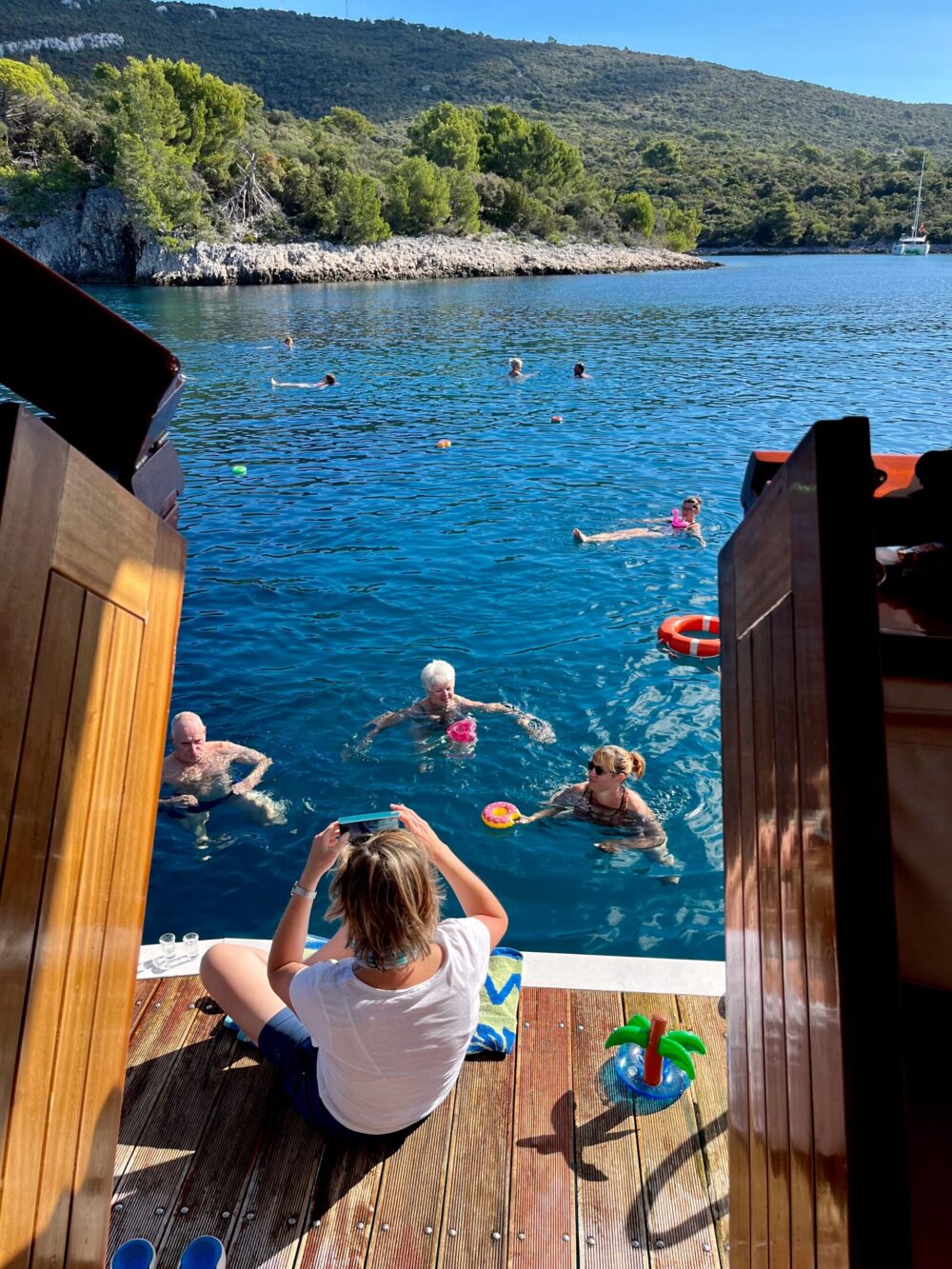 Was die Reisen aber absolut einzigartig macht, sind die täglichen Badestopps. Wir ankern in kleinen Buchten, die mit türkisfarbenem und glasklaren Wasser zu einem Erfrischungsbad einladen. Man kann schwimmen, schnorcheln, sonnenbaden, sich auf Luftmatratzen und Schwimmnudeln treiben lassen und einfach genießen. Das ist wirklich etwas Besonderes und Einmaliges.