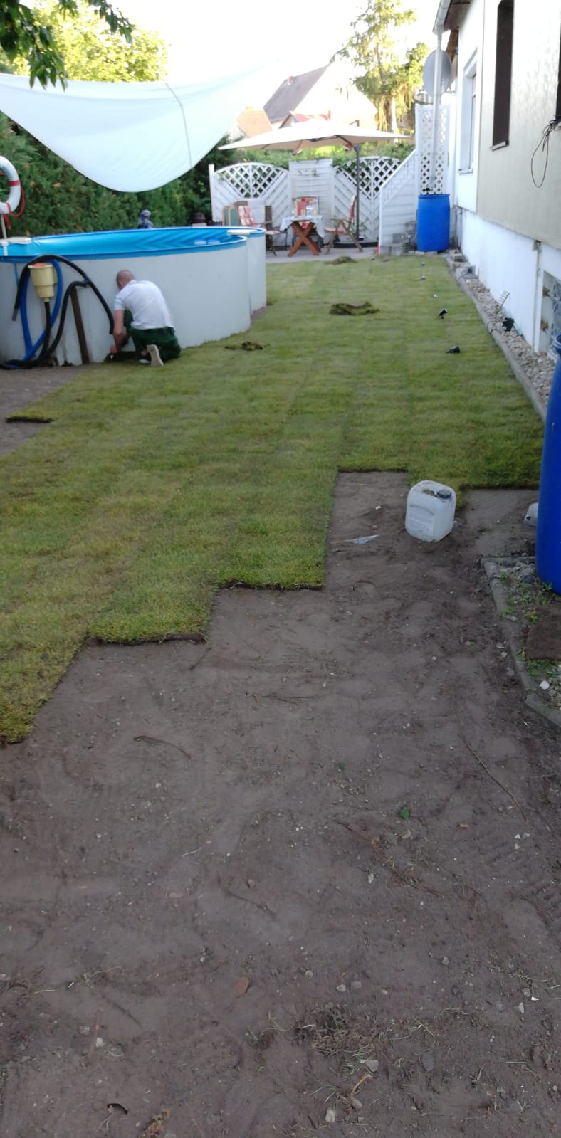 Am Verlegungstag dann schien die Sonne freundlich vom Himmel und es war nicht allzu brütend heiß, was von den das Projekt ausführenden Männern erleichtert zur Kenntnis genommen wurde. Der Profi legte sogleich mit dem Bagger los und trug die alte Boden/Rasenschicht ab. Danach wurde der Boden schön glatt gemacht und ein Anfangsdünger kam auf die Fläche, so dass die Rollrasen-Segmente nun darauf verlegt werden konnten (siehe Bild unten). Das war nach dem Baggereinsatz der Hauptpart an diesem Tag und kostete unseren Gärtner-Freund keine großartige Anstrengung, da er sowas in seinem beruflichen Alltag ständig macht. Nach und nach wurde unser Garten von einem schönen Grün bedeckt, wie wir es uns im Vorfeld erträumt hatten. Die Qualität des bestellten Rollrasens entsprach absolut unseren Vorstellungen!