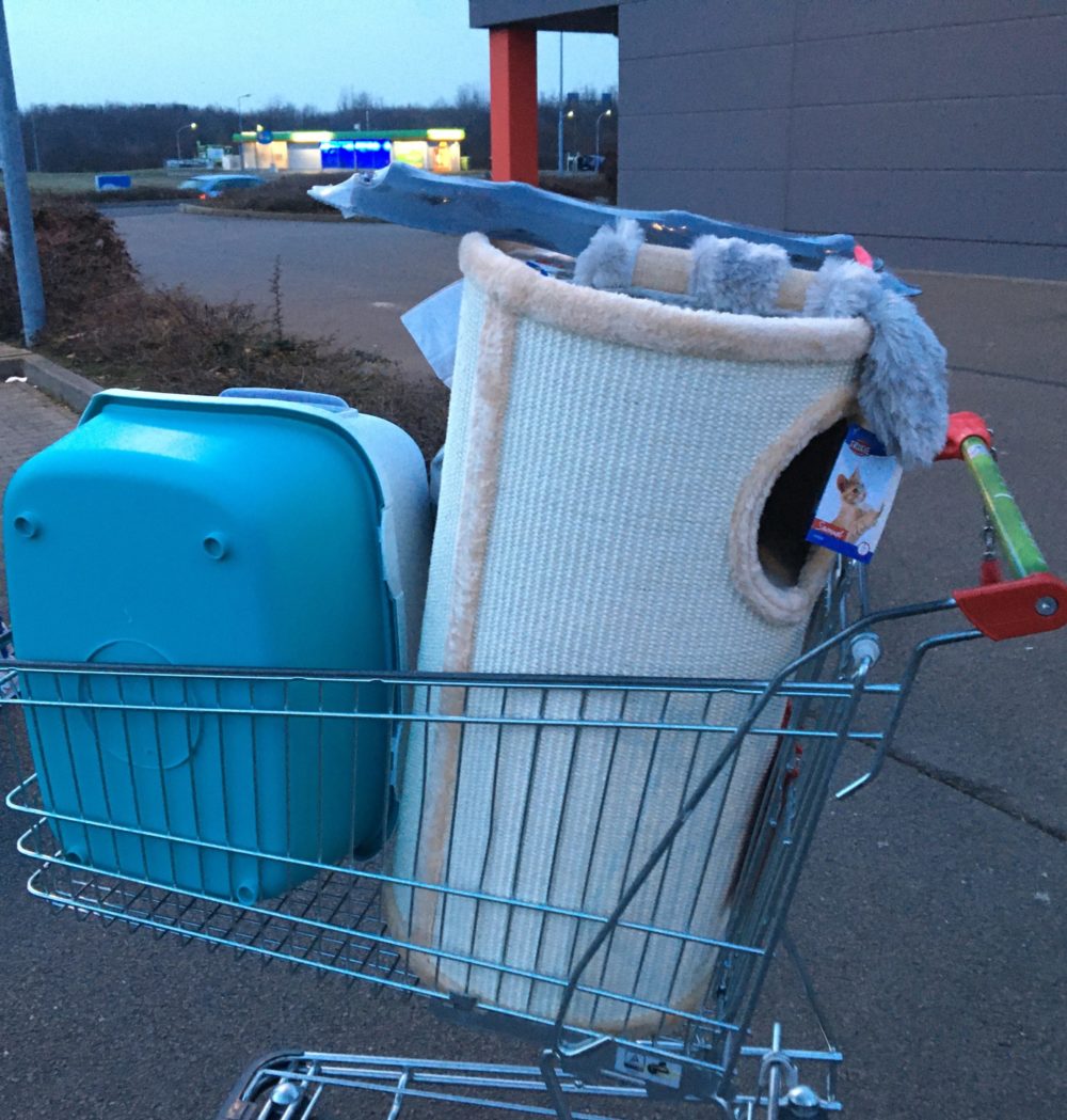 Nachdem wir all das mit dem Leipziger Tierheim geklärt hatten, führte uns der Weg direkt zu einem großen Tierzubehör-Kaufhaus und wir schlugen erst einmal zu: Kratzbaum, Spielzeug, Futter, Katzentoilette, Näpfe und Transportboxen.