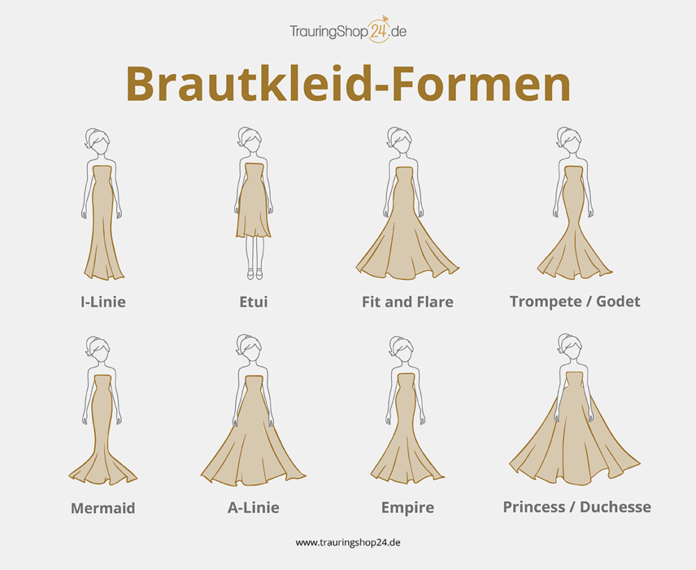 Brautkleidmoden ändern sich von Jahr zu Jahr, aber die Grundformen bleiben eigentlich immer gleich. Hier ist eine praktische Grafik, um das Ganze zu veranschaulichen: