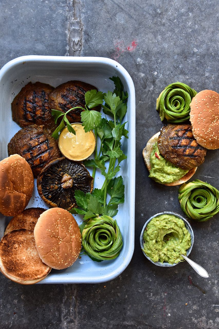 6) Die Pilze, Guacamole, Curry-Mayonnaise und Brötchen ggf. mit den Avocadoröschen auf einer Arbeitsfläche oder einem Tisch anrichten, und schon haben Sie Ihre eigene DIY Portobello Burger Bar, wie auf dem Foto abgebildet, kreiert.