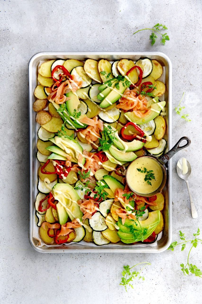 - Das Backblech aus dem Ofen nehmen. Die Avocado und den Lachs auf dem Backblech verteilen. Etwas Sauce Hollandaise darüber geben und mit den Kräutern bestreuen. Den Auflauf mit dem Rest der Sauce servieren.