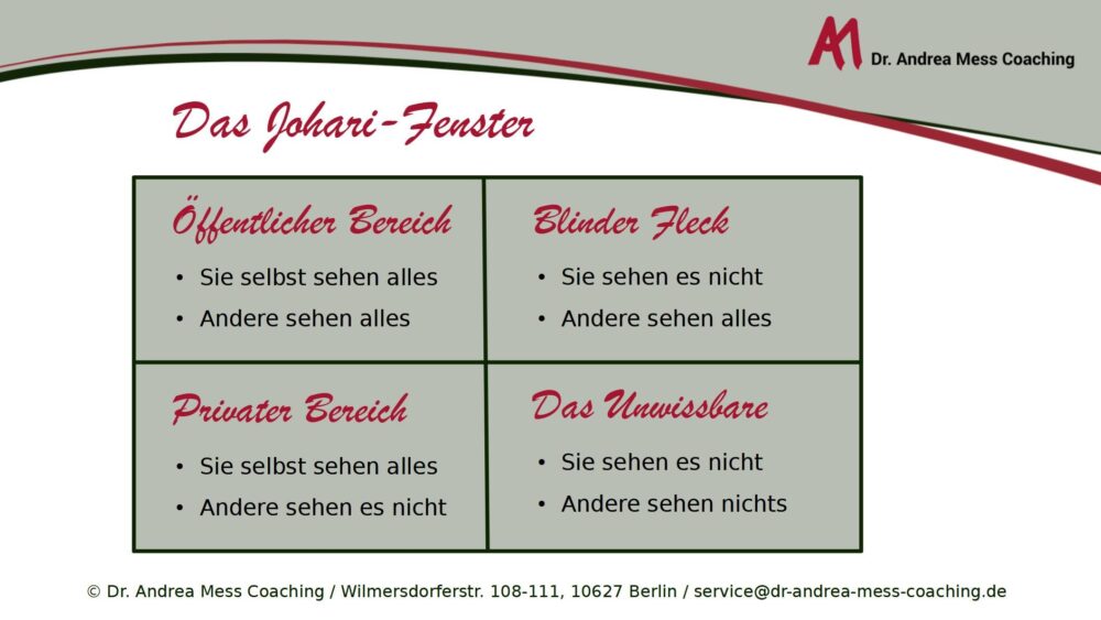 Kommen wir zurück zu den Mustern. Sie verbergen sich im sogenannten Unbewussten. Das heißt, Sie spüren zwar die negativen Folgen, wissen aber nicht, was da in Tiefe los ist. Ergo können Sie nichts dagegen tun und sind Ihren Mustern oft ausgeliefert. Das Zusammenspiel bewusster und unbewusster Persönlichkeitsbereiche zeigt das Johari-Fenster, das 1955 von Joseph Luft und Harry Ingham erarbeitet wurde.
