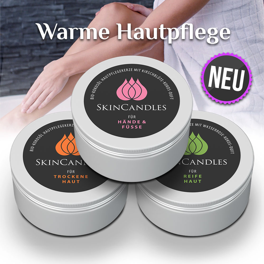 Unsere Beauty-Neuheit, die SkinCandles Hautpflegekerzen sind körperwarme Beauty-Öle, die durch die Wärme besonders gut von der Haut aufgenommen werden – für ein samtweiches Hautgefühl. Sie sind nachhaltig und mit den besten Inhaltsstoffen wie z. B. BIO Kokosöl und Pflegeölen aus der Natur hergestellt.